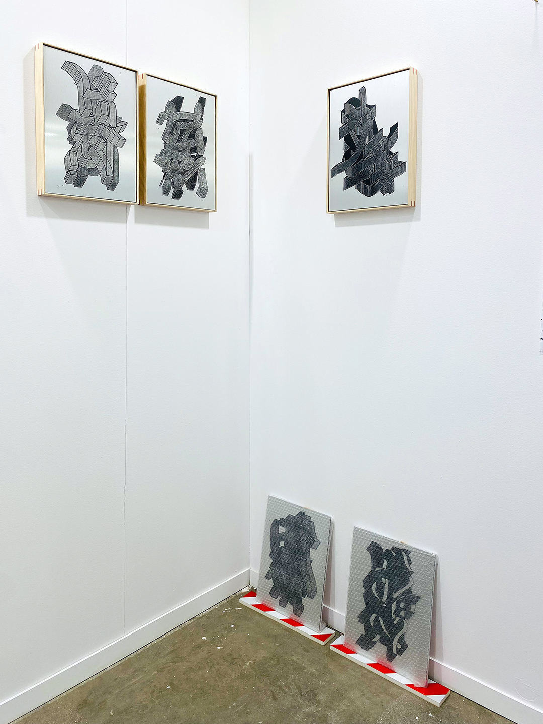 At SWAB 2022, Outline publication was presented as part of Swab’s Reading program. A publication that delves back to Matt Plezier’s interest and short career in graffiti but it remains a big influence, not only on his own handwriting but much of how he perceives the urban landscape. Presented are new framed works on aluminium and cloth.